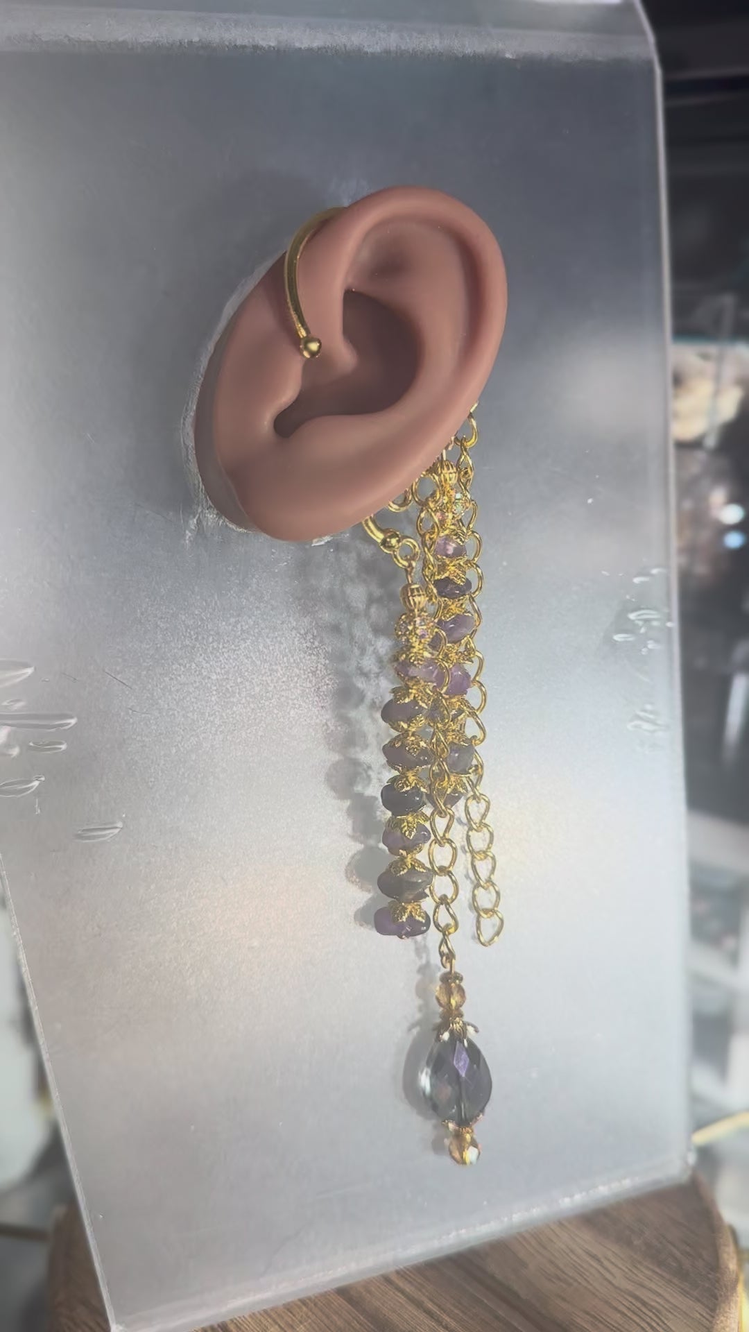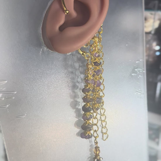 - Style: Gold chain ear cuff with cascading amethyst crystal accents