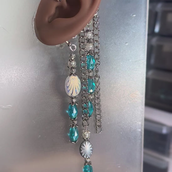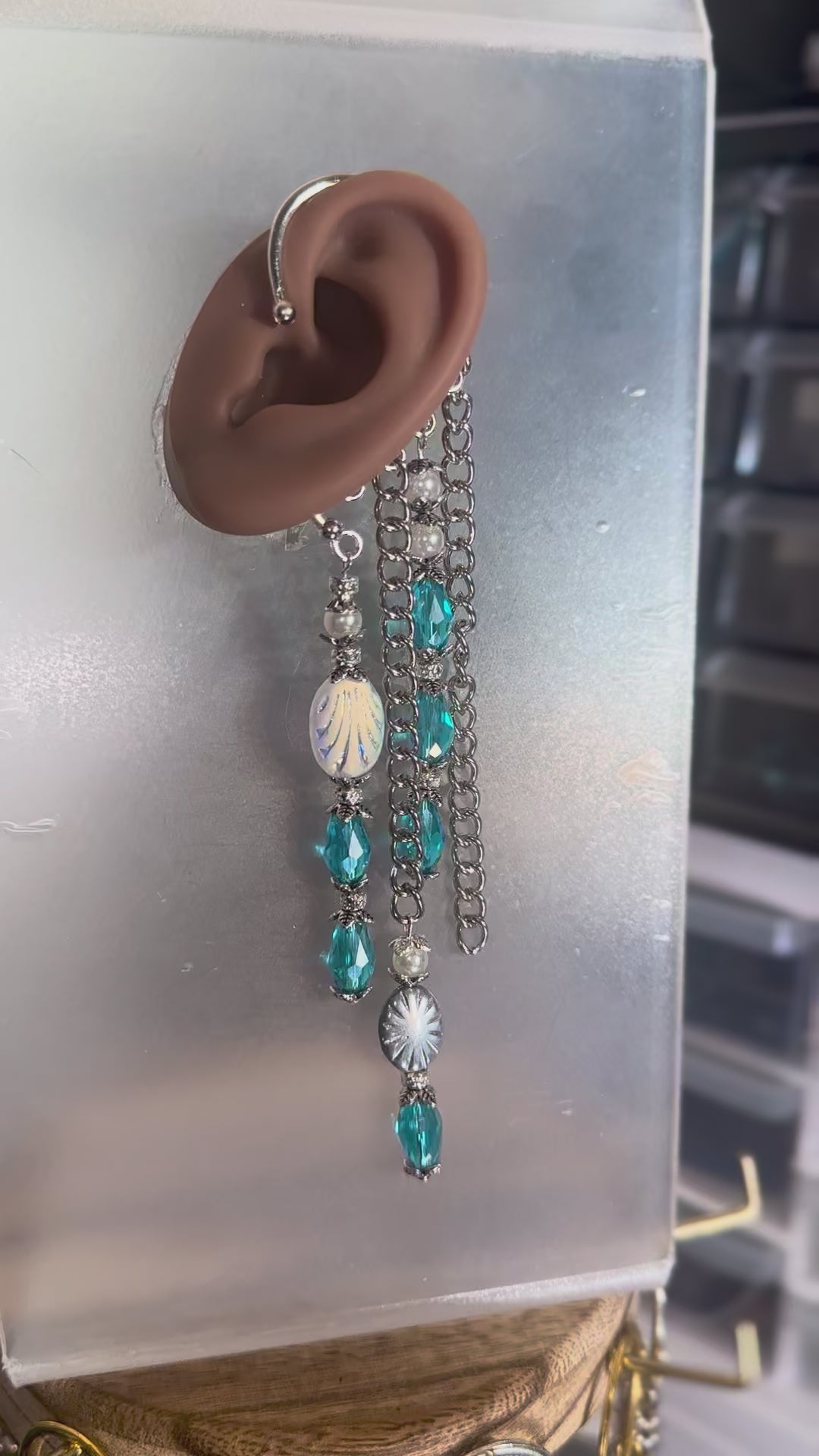 For the goddess who channels the ocean’s rhythm and moves with fluid grace. This ear cuff cascades in shimmering blue crystals, luminous pearls, and silver seashell accents , evoking the call of deep waters and the serenity of the sea. Each strand flows freely, capturing light and motion like sunlit waves. No piercings required , slip it on and embody the siren within.