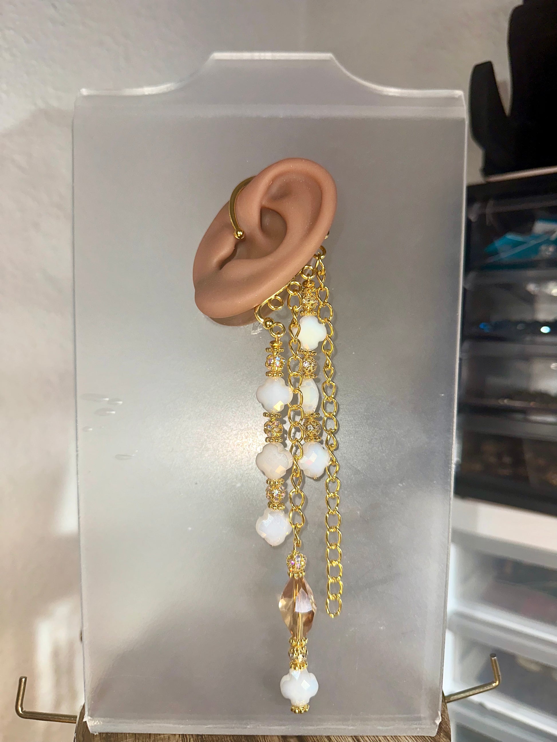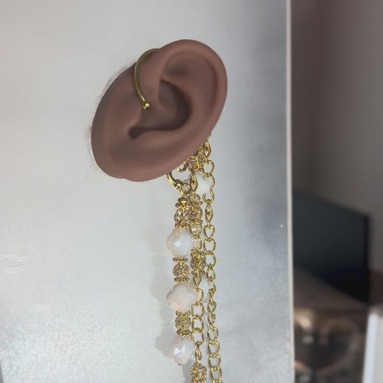 For the goddess who embodies grace and quiet strength, this ear cuff blooms with radiant opalite beads and golden links that shimmer like sunlight on petals. Cascading chains flow gently, anchored by a faceted champagne crystal that captures light with every movement. No piercings required, slip it on and let your divine beauty speak for itself.