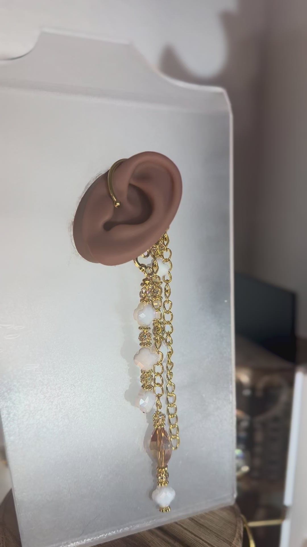 - Style: Statement ear cuff with layered chains and beadwork
