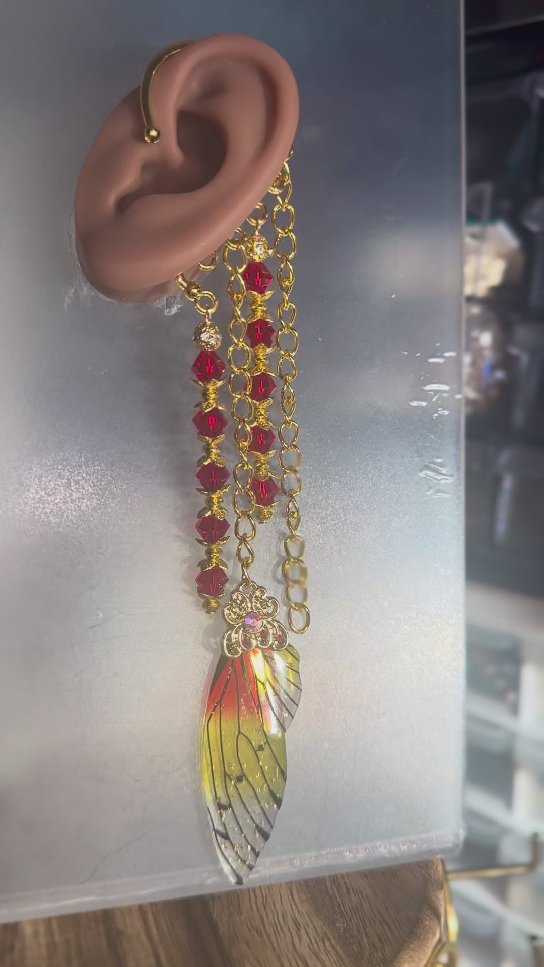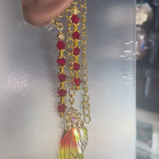For the goddess who carries the flame of confidence and transformation. This ear cuff burns bright with cascading gold chains and fiery red crystals, anchored by a shimmering wing charm that glows in golden ember tones. It symbolizes courage, renewal, and divine power. No piercings required, slip it on and let your inner fire take flight.