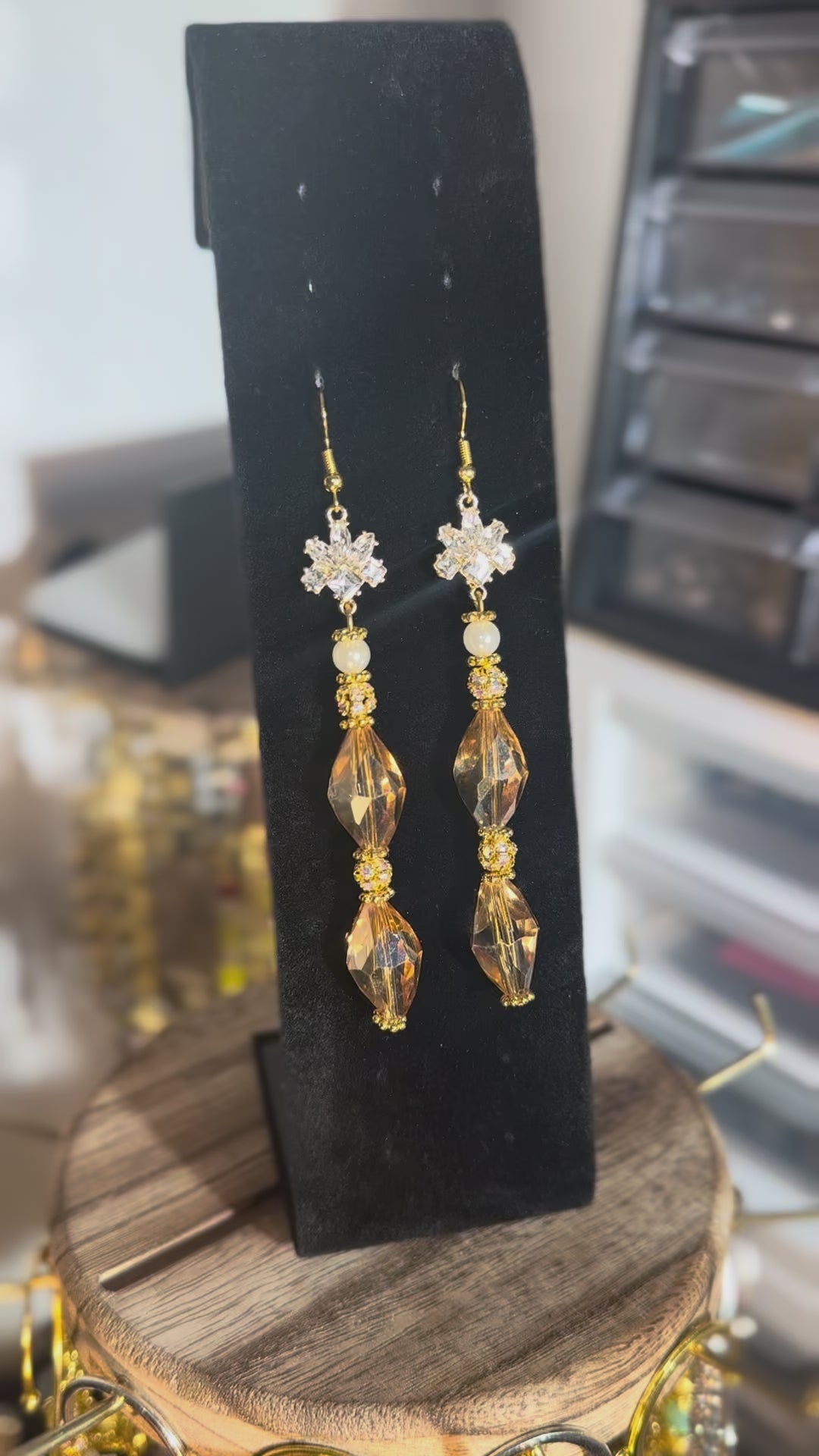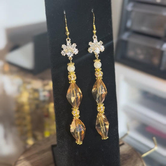 For the goddess who glows with warmth and regal strength. These earrings cascade in faceted golden crystals, accented with delicate pearls and a radiant floral charm at the top. They capture the essence of sunlight and divine beauty, empowering you to shine wherever you go.