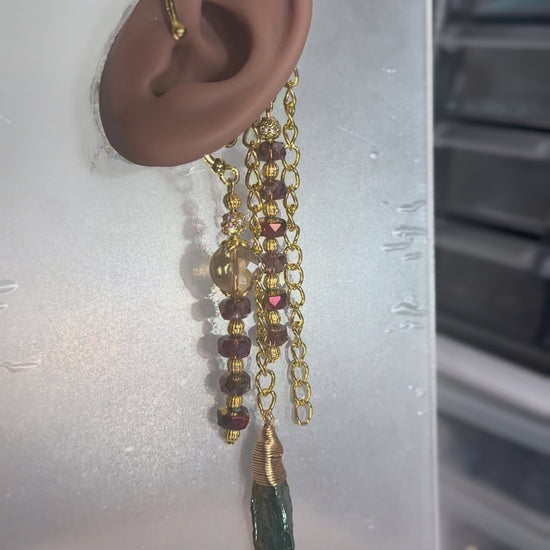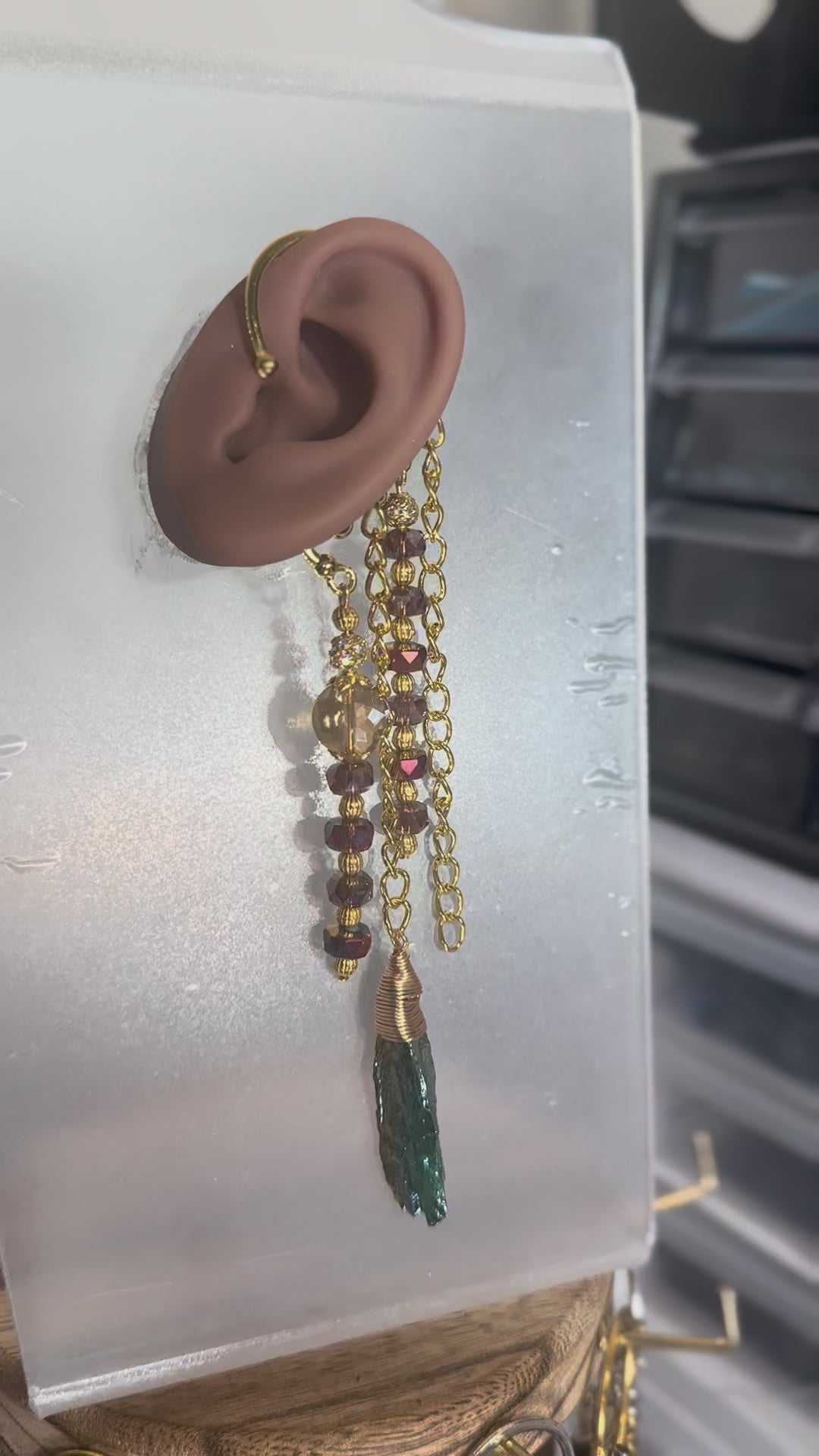 For the goddess who stands grounded yet glows with golden power. This ear cuff drapes in earthy tones of deep green and warm gold, anchored by a striking crystal point that channels the strength of nature itself. Its elegant beadwork and layered chains flow with balance, beauty, and divine energy. No piercings required , slip it on and embody your natural radiance.