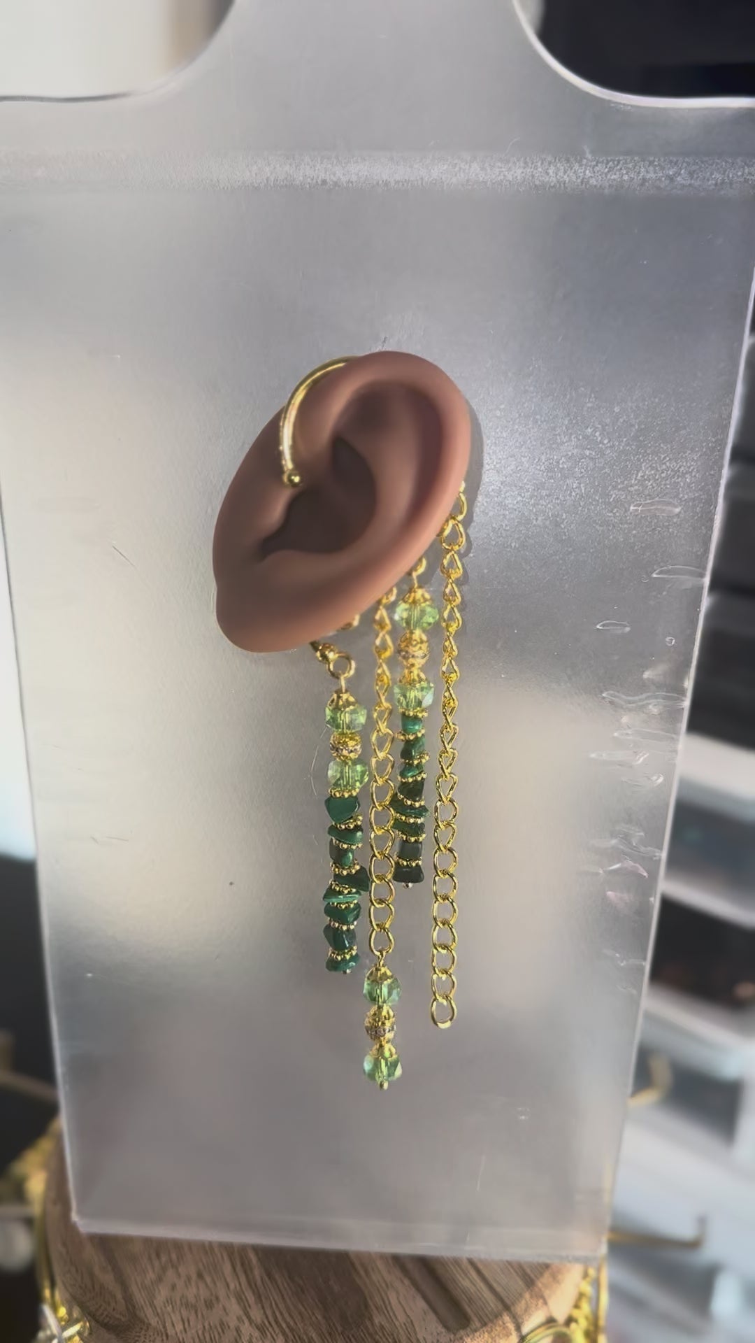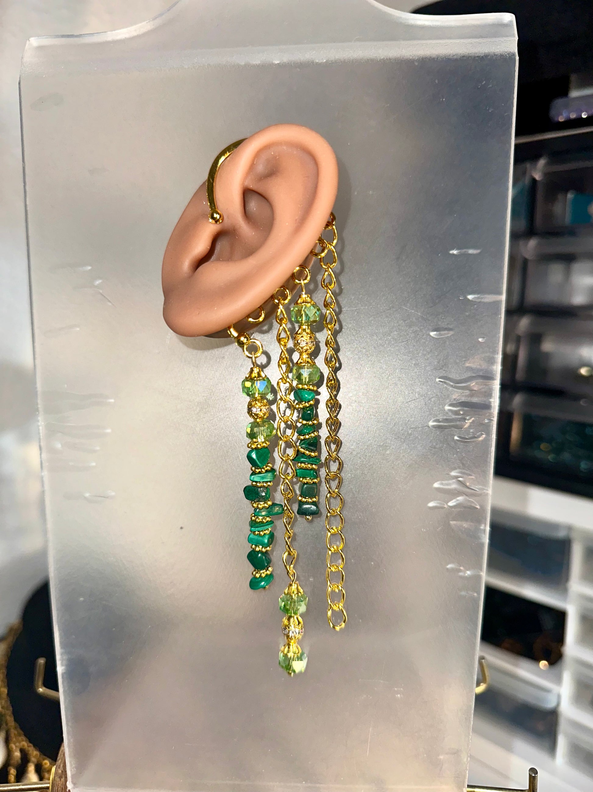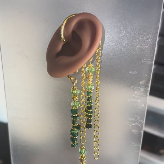 For the goddess who radiates grounded power and divine balance. This ear cuff flows in layers of hand-wrapped malachite stones, shimmering gold accents, and cascading chains that capture the light with every turn. Each dangling piece is wire-wrapped by hand, symbolizing intention, strength, and artistry.