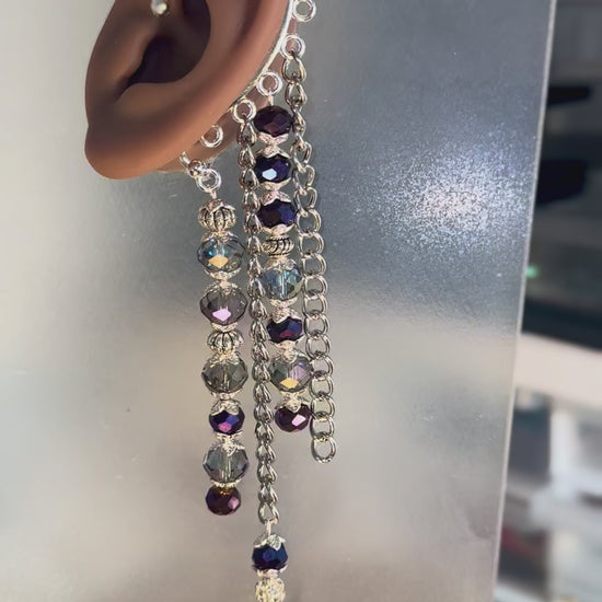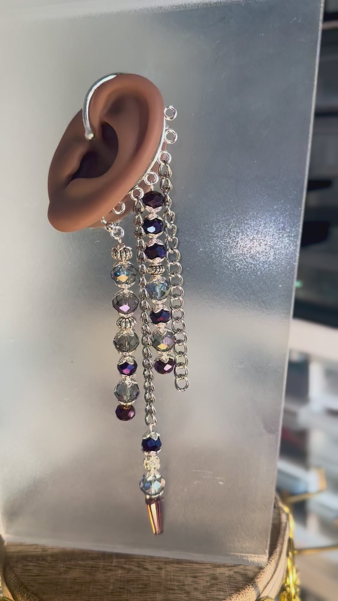 For the goddess who walks between realms of light and shadow. This ear cuff drapes in cascading silver chains adorned with deep violet and shimmering crystal beads, reflecting mystery and cosmic energy. Anchored with a sleek metallic spire charm, it symbolizes power, intuition, and protection. No piercings are required,simply slip it on and embrace your divine edge.