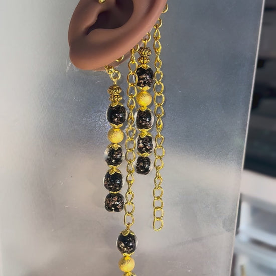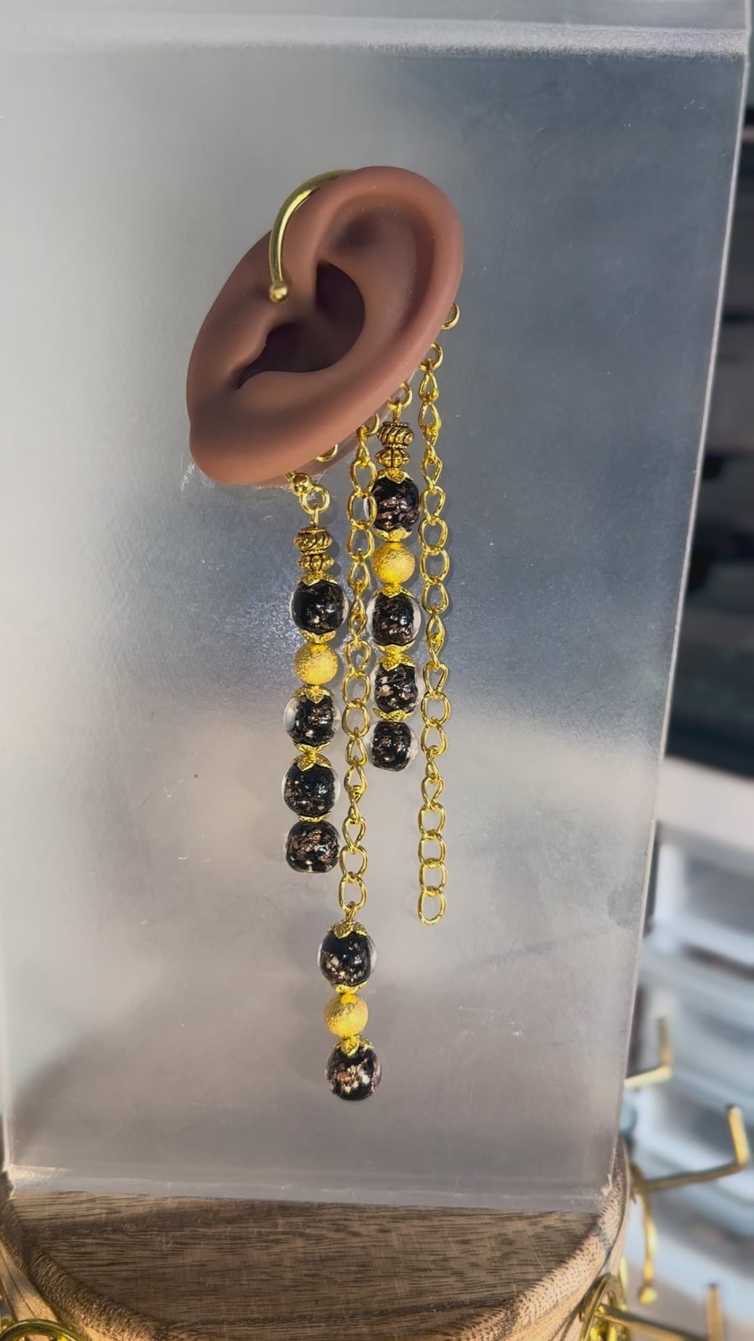 For the goddess who embodies mystery and radiant strength. This ear cuff cascades with golden chains, adorned in rich black and gold-speckled beads that shimmer like cosmic sparks. Each strand flows with bold elegance, grounding your divine aura in both power and grace. No piercings are required, slip it on and let your light shine through the darkness.