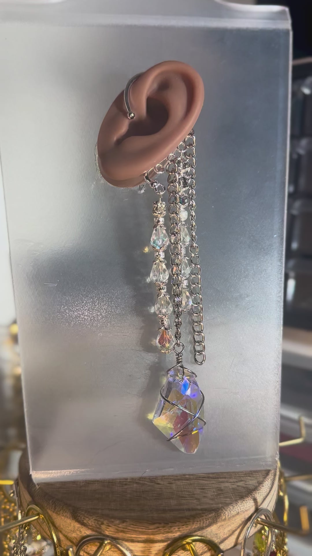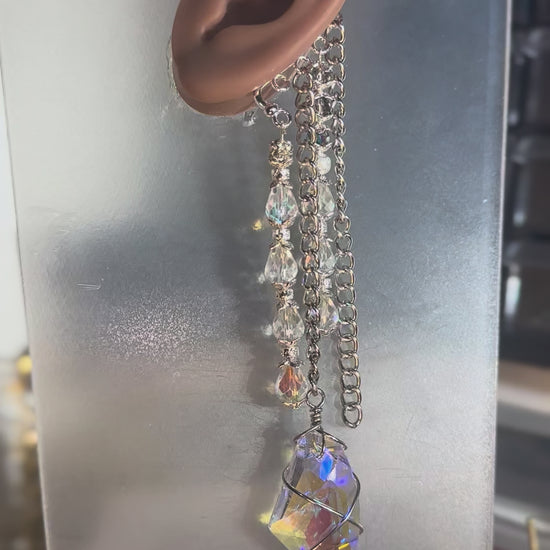 For the goddess who shines with divine clarity, Crystal Whisper drapes in shimmering silver chains kissed with faceted glass beads. Finished with a radiant prism charm wrapped in silver, it reflects light into a rainbow aura, symbolizing illumination, guidance, and higher vision. No piercings required, slip it on and embody your celestial glow.